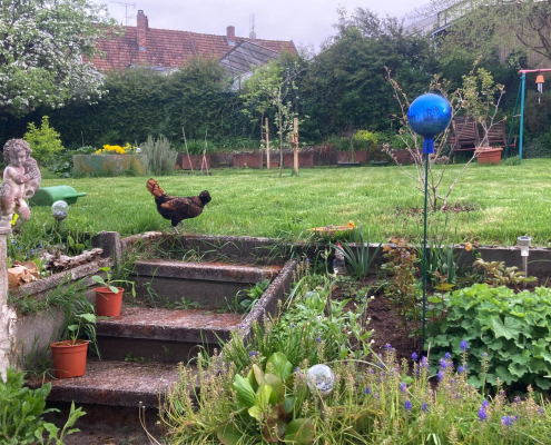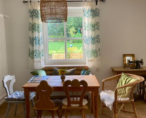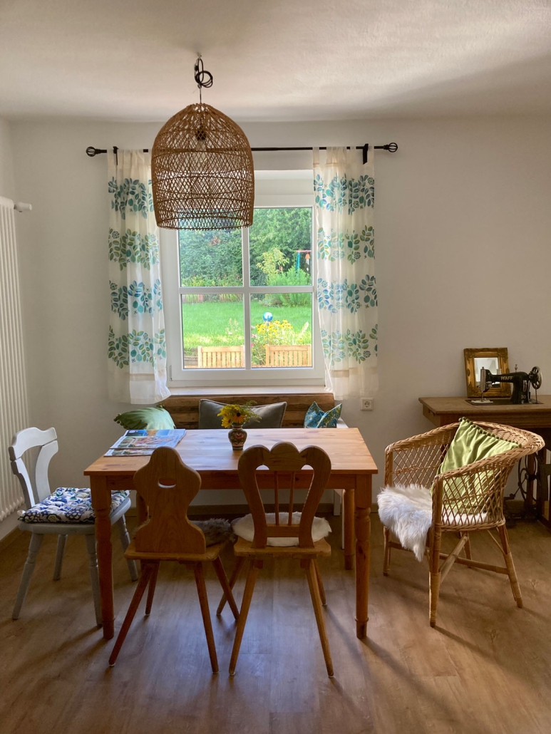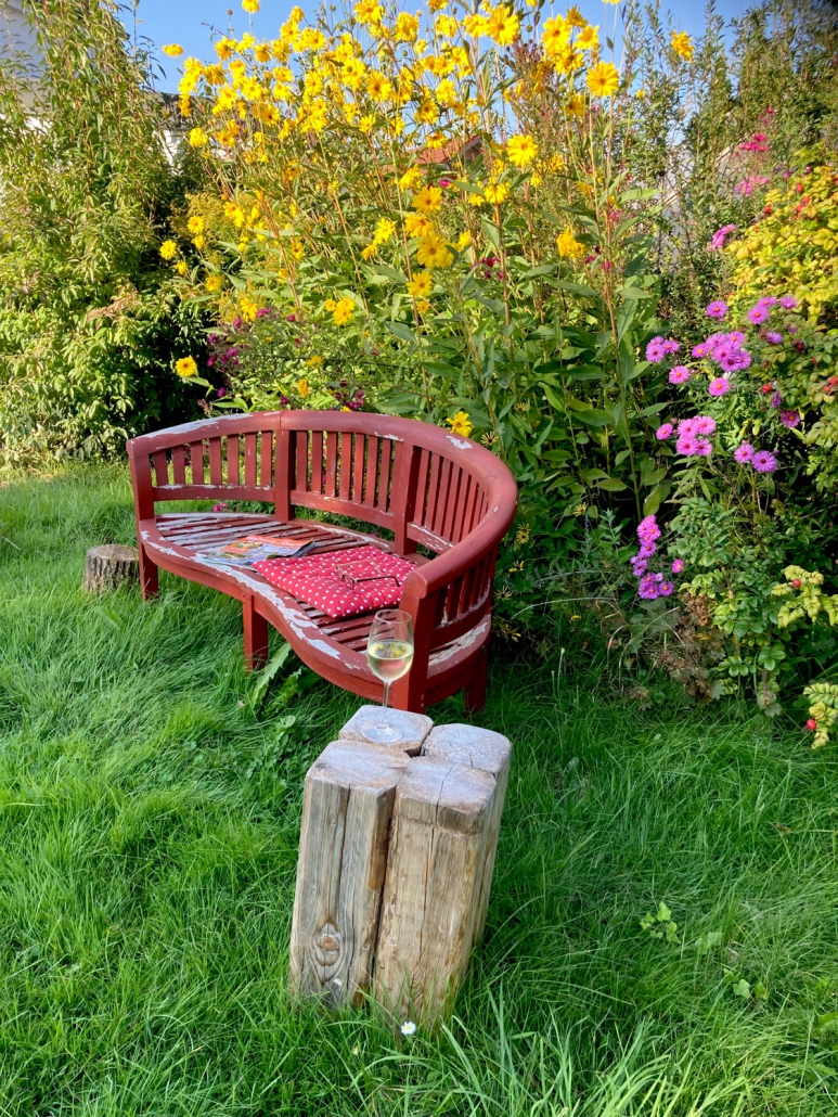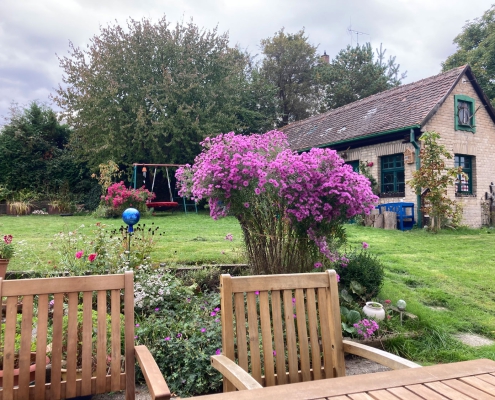 Die sonnige Terrasse sowie der rund 700 qm große und ein bisschen wilde Naturgarten laden zum Entspannen und Grillen ein – Grillplatz und Grill stehen zur Verfügung. Im Garten steht ein Nebengebäude (Werkstatt und Holzlege), das für Gäste nicht nutzbar ist – aber es ist trotzdem genug Platz zum Spielen und Toben. Und natürlich zum Chillen. Eine Schaukel gibt es auch.