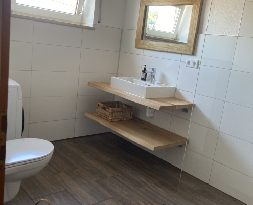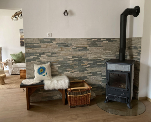 Die ganze Wohnung ist geschmackvoll im Landhausstil mit entweder neuen oder restaurierten Möbeln eingerichtet – mit einer Ausnahme: Die Schrankwand im Wohnzimmer. Blandinas Eltern haben sie sich zur Hochzeit von einem Schreiner machen lassen – und wir schaffen es emotional noch nicht, uns von ihr zu trennen :).